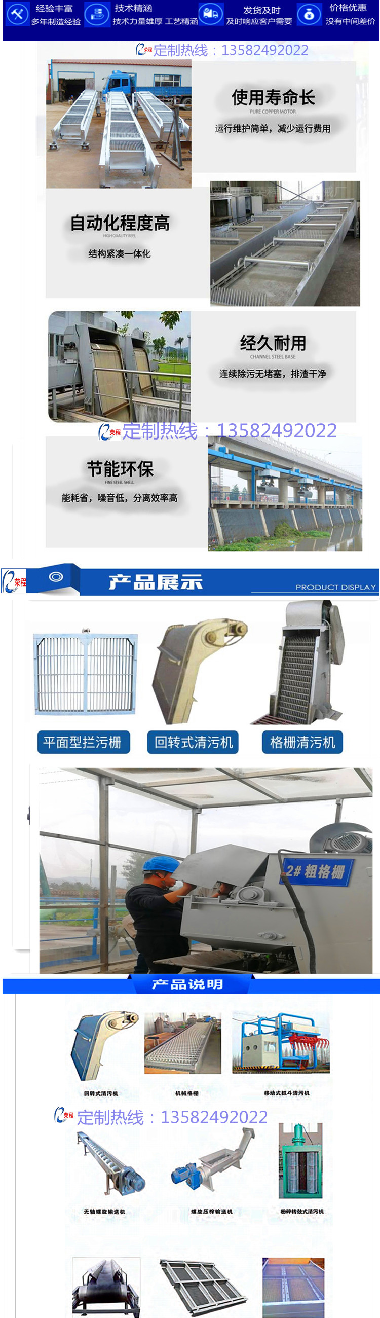回轉(zhuǎn)式格柵除污機是一種可以連續(xù)自動攔截并清除流體中各種形狀雜物的水處理專用設備,可廣泛地應用于城市污水處理。自來水行業(yè)、電廠進水口,同時也可以作為紡織、食品加工、造紙、皮革等行業(yè)廢水處理工藝中的前級篩分設備。